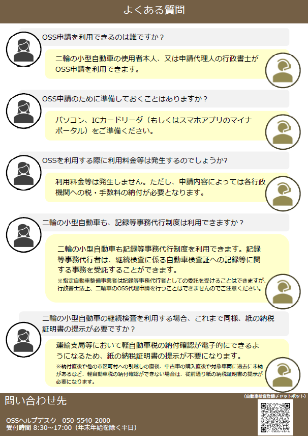 なお、対象となるのは軽自動車の「新車購入時」の手続のみです。原動機付自転車・自動二輪車・小型特殊自動車はOSSの対象ではありません。