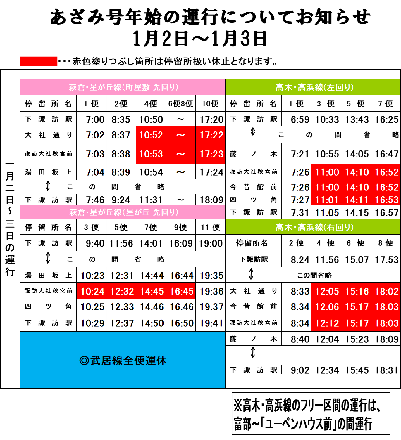 年末年始の諏訪大社秋宮周辺の交通規制に伴い、町内循環バス「あざみ号」は下記のとおり一部運休・バス停休止・迂回運行となります。ご迷惑をお掛けいたしますが、ご理解ご協力のほどよろしくお願いいたします。