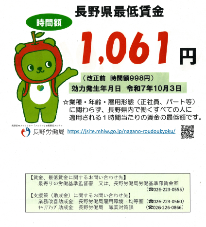 長野県内の事業場で働く全ての労働者に適用される「長野県最低賃金」が令和7年10月3日から「時間額1,061円」に改正されます。