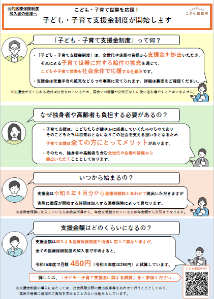 令和8年度から開始する「子ども・子育て支援金制度」は、全世代の皆様から支援金を拠出いただき、それによる子育て世帯に対する給付の拡充を通じて、こどもや子育て世帯を社会全体で応援する仕組みです。子育て世帯への経済的支援を拡充するため、令和8年度4月分からみなさんが加入している医療保険料(社会保険、国民健康保険、後期高齢者医療保険など)とあわせて「子ども・子育て支援金」を負担していただくことになります。