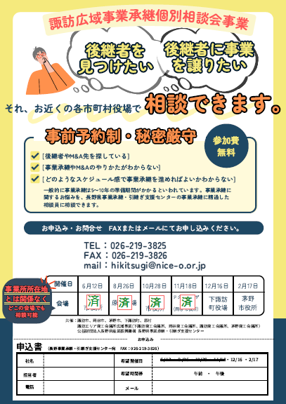 「後継者を見つけたい」、「後継者に事業を譲りたい」、「事業承継に関する理解を深めたい」といった、事業承継に係るお悩み等がある方を対象に長野県事業承継・引継ぎ支援センターの専門相談員による個別相談会を開催しています。