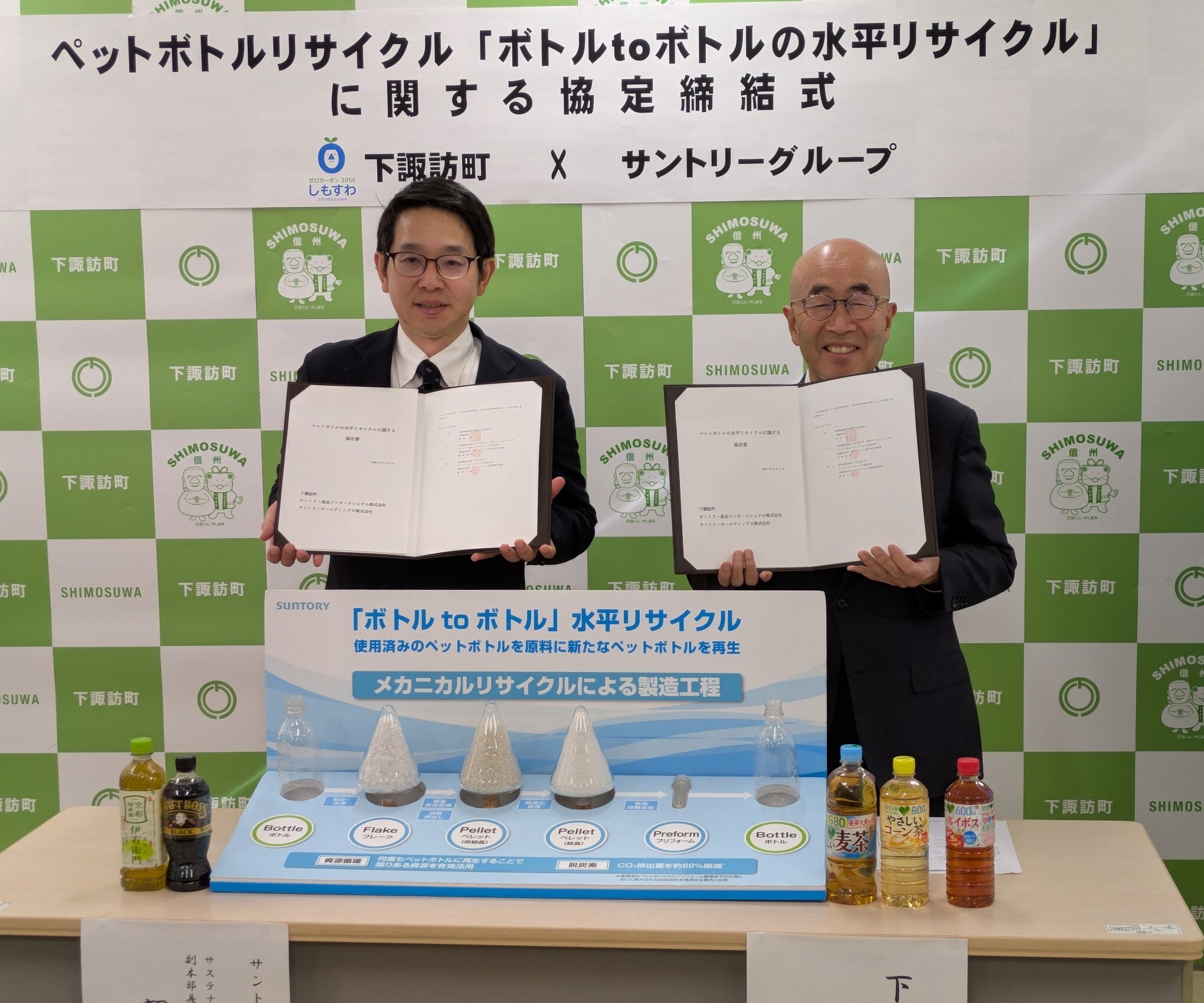 下諏訪町は、飲料メーカーであるサントリーグループと使用済みペットボトルを新たなペットボトルに生まれ変わらせる「ボトルtoボトル」水平リサイクルに関する協定を令和7年11月17日に締結しました。
