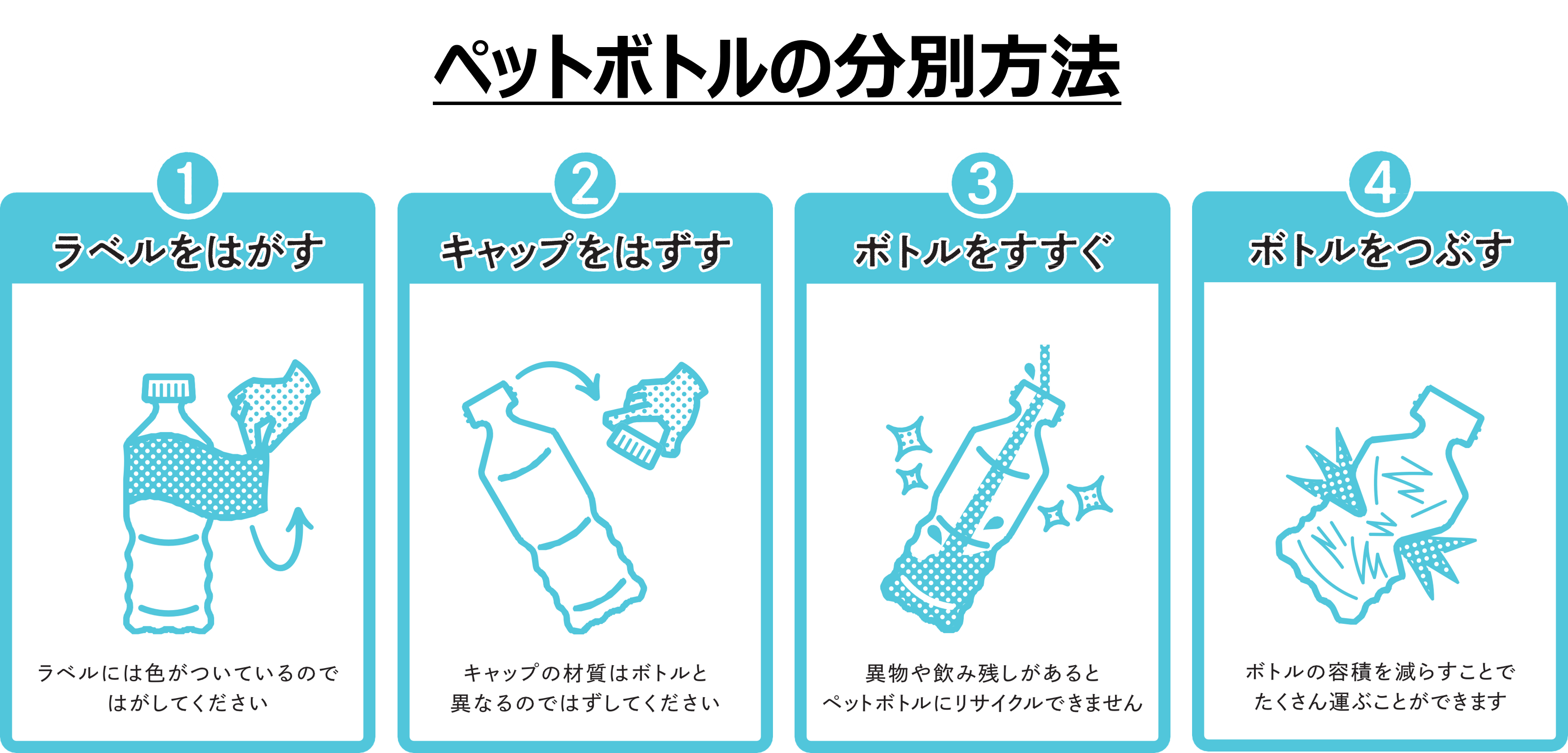 町民の皆さまには、引き続きラベルをはがす、キャップをはずす、ボトルをすすぐ、ボトルをつぶすといった分別方法にご協力をお願いします。(分別方法に変更はありません。)