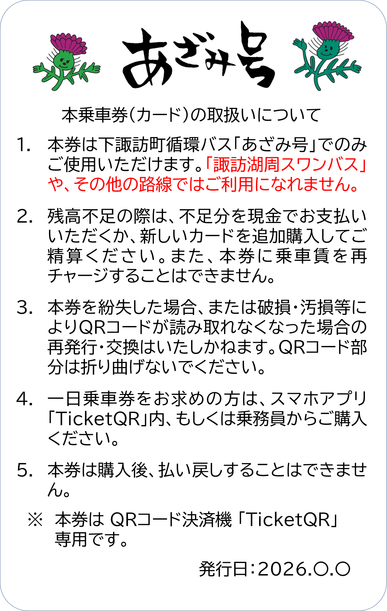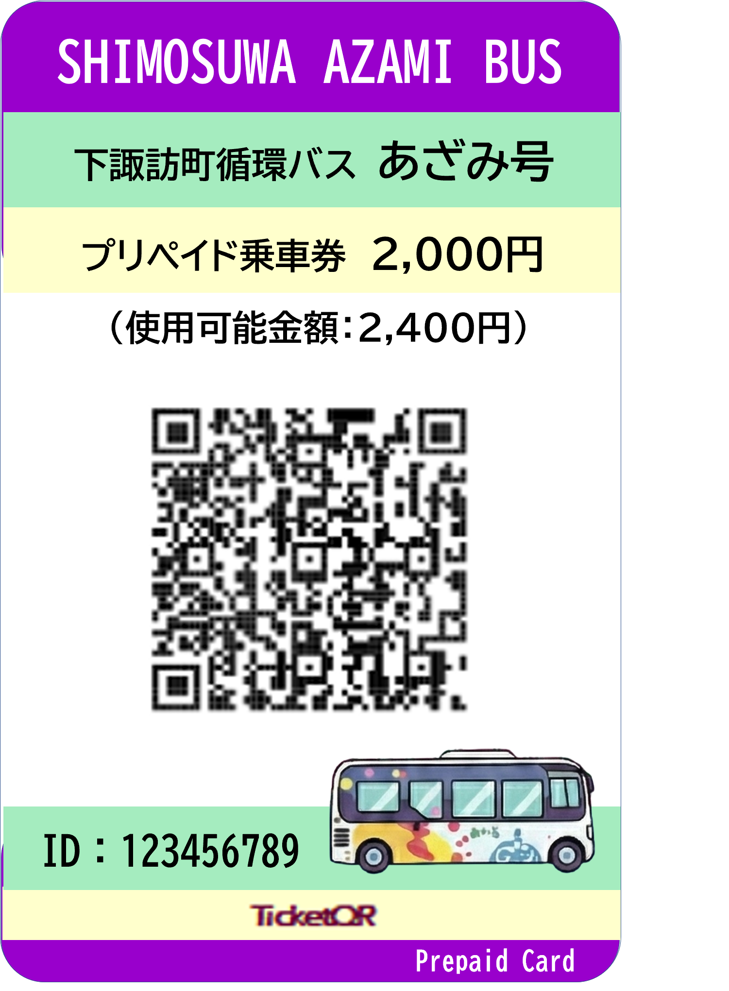 下諏訪町では、循環バス「あざみ号」の利便性向上を目的として、新たにスマートフォンアプリ等を利用したキャッシュレス決済システム「TicketQR(チケットQR)」を導入いたします。